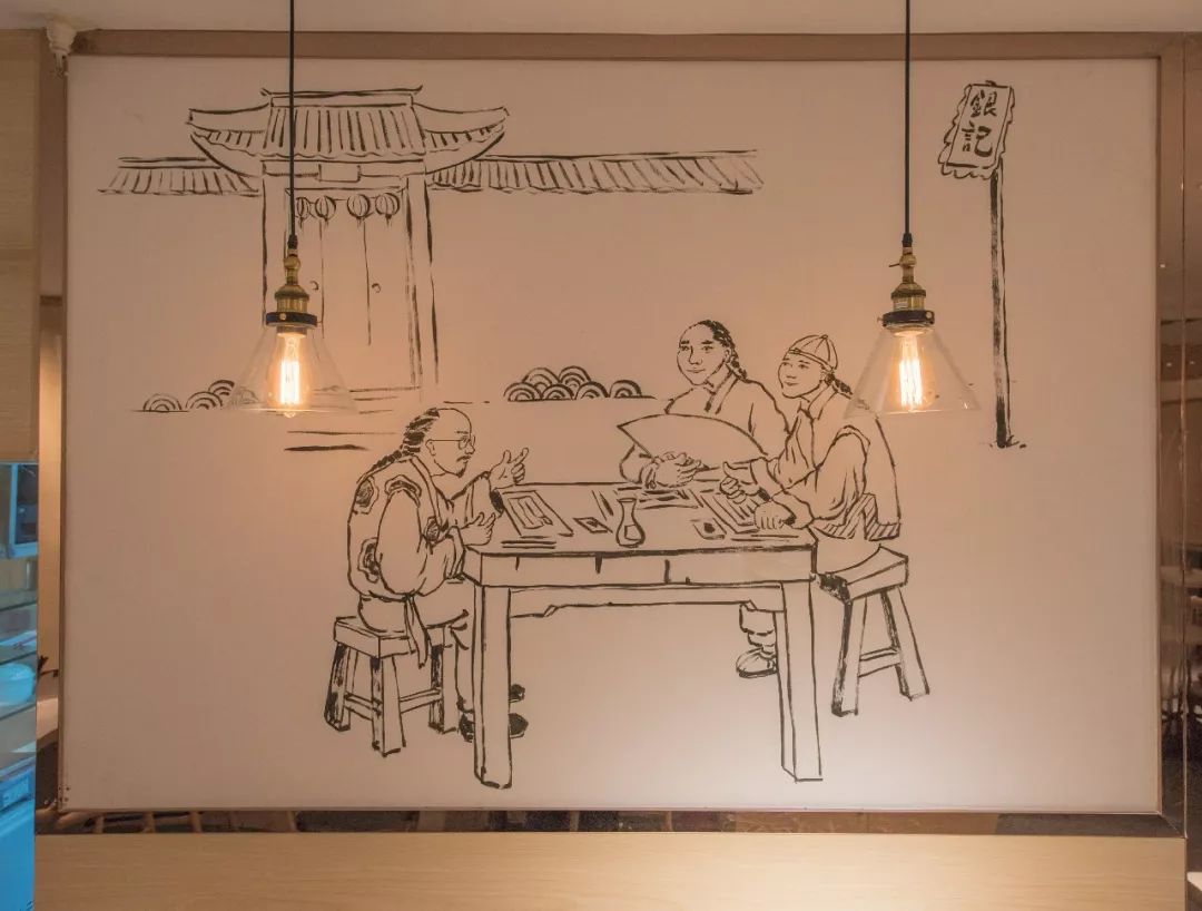 文化墙部分采用古风十足的手绘画展示品牌的主营产品和文化历史,将银记肠粉多年来传承下来的岭南建筑和西关风情等老字号特色进行展示,体现出与一众时尚化新品牌不同的历史文化内涵。